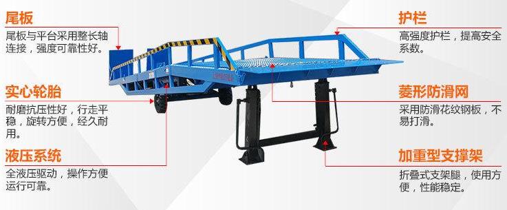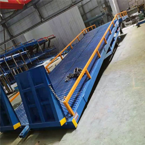 裝卸登車橋-移動式機械登車橋用于無裝卸設備的貨臺及流動裝卸場所,是與叉車配合使用的貨物裝卸輔助設備。借助移動式登車橋,叉車能直接駛入汽車集裝箱內部進行批量裝卸作業。